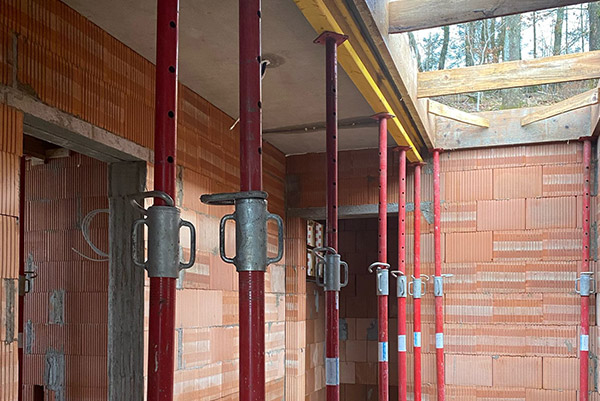 -Schalung & Abstützung: Bei Ortbetondecken wird eine stabile Schalung mit Baustützen errichtet.
